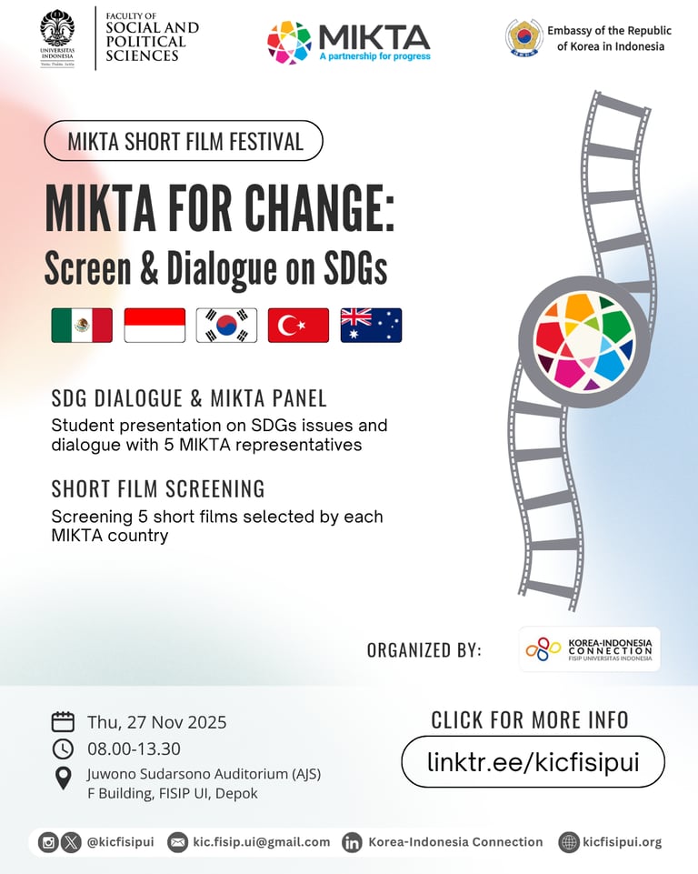 “MIKTA for Change: Screen & Dialogue on SDGs” is designed to raise awareness and foster dialogue on the role of MIKTA in global diplomacy, with a strong focus on the Sustainable Development Goals (SDGs). The event will feature student presentations on SDGs issues and dialogue with 5 MIKTA representatives from Mexico, Indonesia, the Republic of Korea, Türkiye, and Australia, followed by a film screening of 5 films selected by each MIKTA countries.